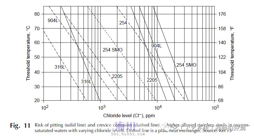 循環(huán)水是常見的含氯離子介質(zhì),有些地方水質(zhì)比較差,如內(nèi)蒙地區(qū)的工業(yè)水中氯離子濃度能達(dá)到100~200PPM,再加上3~4倍的濃縮倍數(shù),循環(huán)水供水中氯離子濃度可能高達(dá)600~800PPM,需要格外注意不銹鋼材質(zhì)的應(yīng)力腐蝕問題。解決辦法如果涉及的不銹鋼換熱設(shè)備比較多,建議提高循環(huán)水的水質(zhì),比如降低濃縮倍數(shù),但象內(nèi)蒙這種缺水的地方,不太適合,也可以在循環(huán)水補(bǔ)水前先加軟水裝置,降低氯離子濃度后再作為補(bǔ)水;如果只是個(gè)別設(shè)備,則可考慮按上圖使用高耐腐蝕性的材質(zhì)如904L或者254 SMO等。